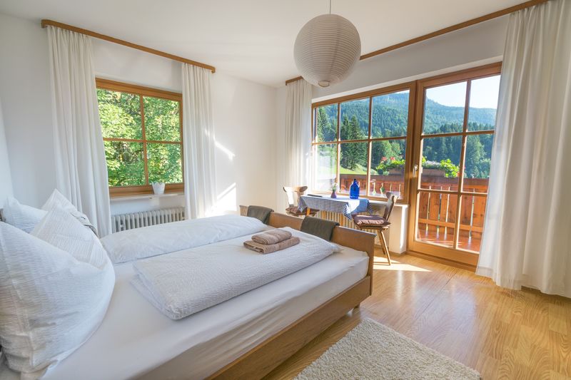 Morgens aufwachen mit einem herrlichen Blick auf die Berge im Chiemgau, eine wohltuende Yogasstunde am Morgen.